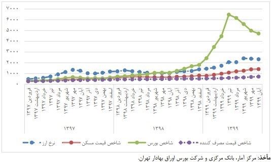 نرخ ارز در سامانه نیما در سال 1399 از حدود 13 هزار تومان به 25 هزار تومان رسیده و در حدود 90 درصد رشد داشته است. متناسب با رشد نرخ ارز، شاخص کالاهای بادوام نیز در هشت ماهه اول سال 1399 رشد حدود 85 درصدی داشته است.