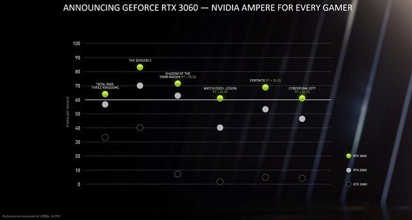 NVIDIA نمی گوید که سرعت 3060 نسبت به RTX 2060 دو ساله چقدر سریعتر است اما نمودار بالا نشان می دهد که تفاوت آنچنان قابل توجه نیست. اگر آن را با RTX 2060 Super مقایسه کنید ، NVIDIA در اینجا وانمود کرده است که این موجودیت وجود ندارد ، این شکاف حتی کمتر خواهد بود. RTX 3060 حدود 329 دلار قیمت دارد و فقط به عنوان کارت سفارشی OEM ها از جمله ASUS ، Colorful ، EVGA ، Gainward ، Galaxy ، Gigabyte ، Innovision 3D ، MSI ، Palit ، PNY و Zotac در نسخه های موجود در دسترس خواهد بود.