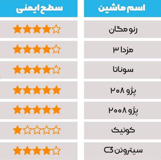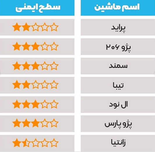 سطح ایمنی هر کدام از خودرو های داخلی را ببینید