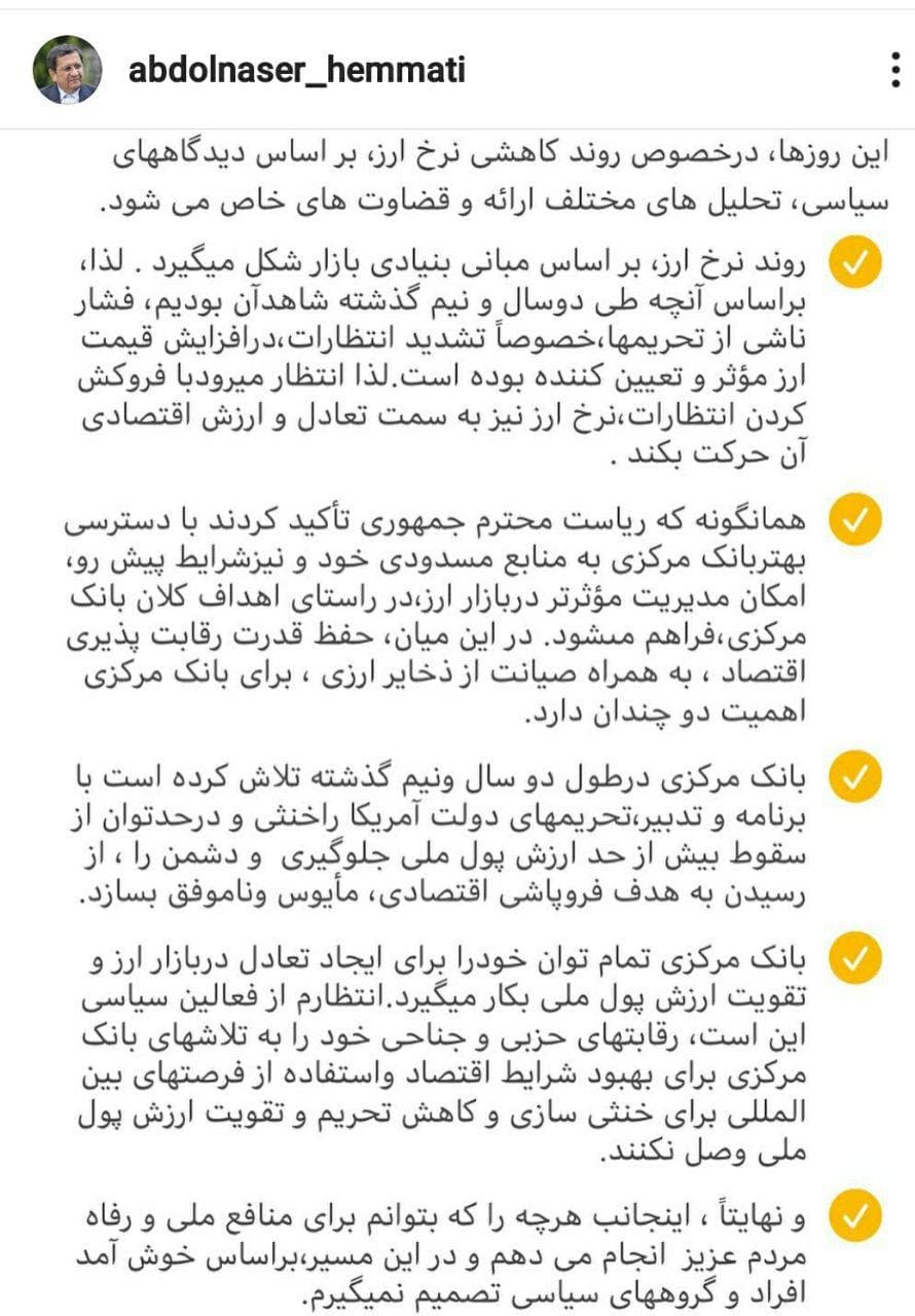 به گزارش سایت طلا، عبدالناصر همتی رئیس کل بانک مرکزی در یادداشت جدیدی نوشت: "این روزها، درخصوص روند کاهشی نرخ ارز، بر اساس دیدگاههای سیاسی، تحلیل های مختلف ارائه و قضاوت های خاص می شود.