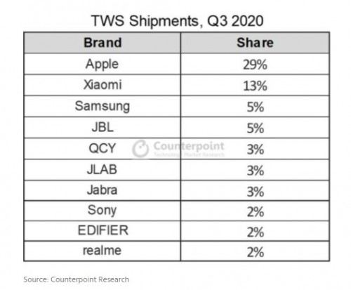 پنج برند از ده مارک برتر قابل فروش TWS قابل فروش با امتیاز زیر 50 دلار را به فروش رسانده اند.Realme در حال حاضر در Q3 2020 سهم 2 درصدی دارد ، اما تحلیلگران بر این باورند که حضور آنلاین پرقدرت این برند و سابقه آن با انفجار سهم بازار تلفن های هوشمند می تواند با قابلیت های قابل پرداخت نیز منعکس شود.