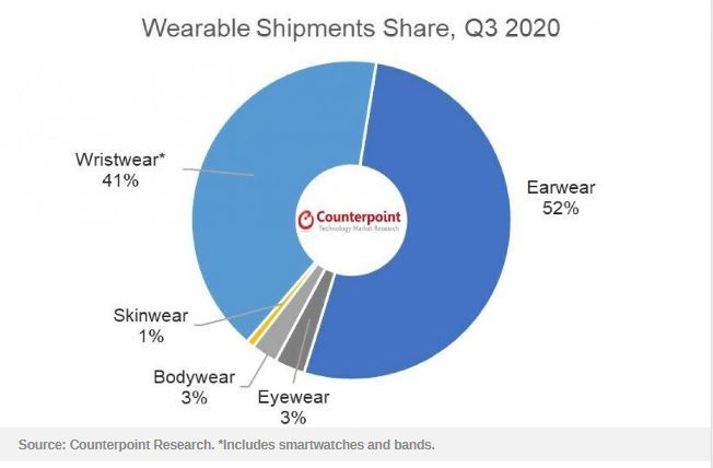 گزارش جدید منتشر شده توسط Counterpoint Research ، می گوید بازار پوشیدنی ها به سرعت به رشد خود ادامه می دهند. آخرین تحقیقات نشان می دهد که 52 درصد از پوشیدنی ها در نیمه سوم سال 2020 از پوشیدنی ها تشکیل شده است. ساعت های هوشمند و ردیاب های تناسب اندام 41٪ را تشکیل می دهند. لباس های پوستی ، لباس های بدن و عینک سهم 7٪ باقی مانده را به خود اختصاص داده اند.