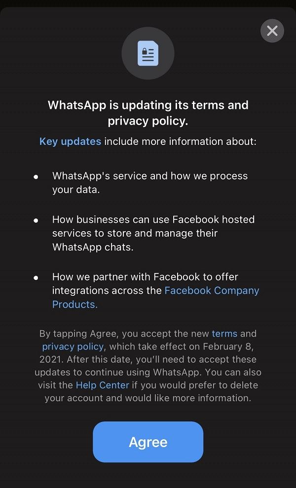 اوایل این ماه ، WhatsApp هنگام راه اندازی برنامه شروع به ظاهر شدن شرایط جدید و صفحه سیاست حفظ حریم خصوصی خود کرد. صفحه از کاربران می خواهد تا بر روی موافق کلیک کرده و شرایط جدید را بپذیرند ، شرایطی که از 8 فوریه اعمال می شود. شما می توانید پنجره بازشو را رد کنید اما اگر می خواهید پس از 8 فوریه به استفاده از سرویس ادامه دهید ، باید با آنها موافقت کنید.