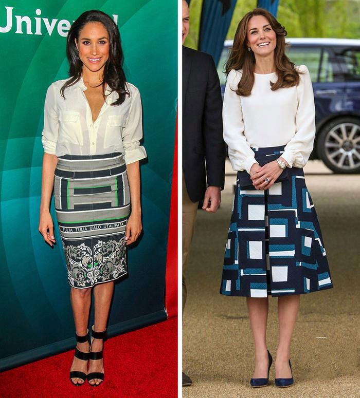 3. طرح های هندسی یکی از بهترین گزینه ها برای استایل کلاسیک هستند که مگان و کیت هر دو از این طرح ها در لباس و دامن های خود الهام می گیرند.