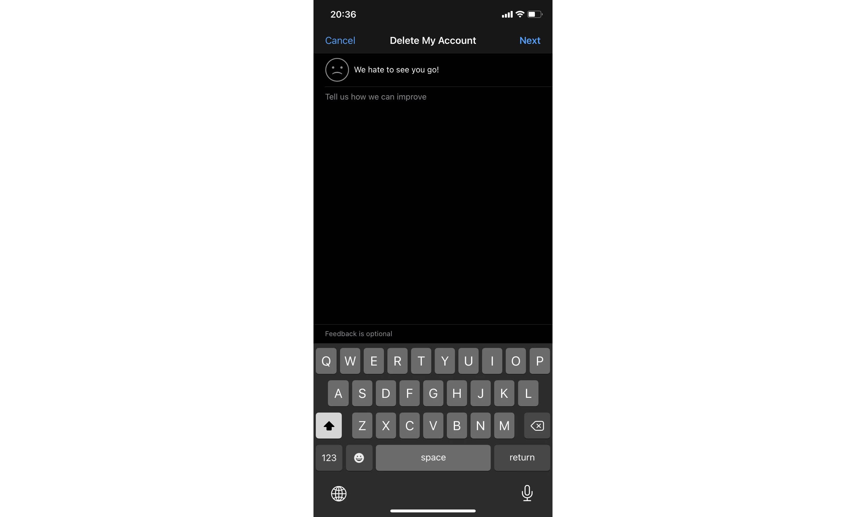 ۴. گزینهی Delete my account، آخرین گزینهی موجود در صفحهی تنظیمات (در هر دو سیستمعامل اندروید و iOS) را پیدا کنید و روی آن ضربه بزنید.