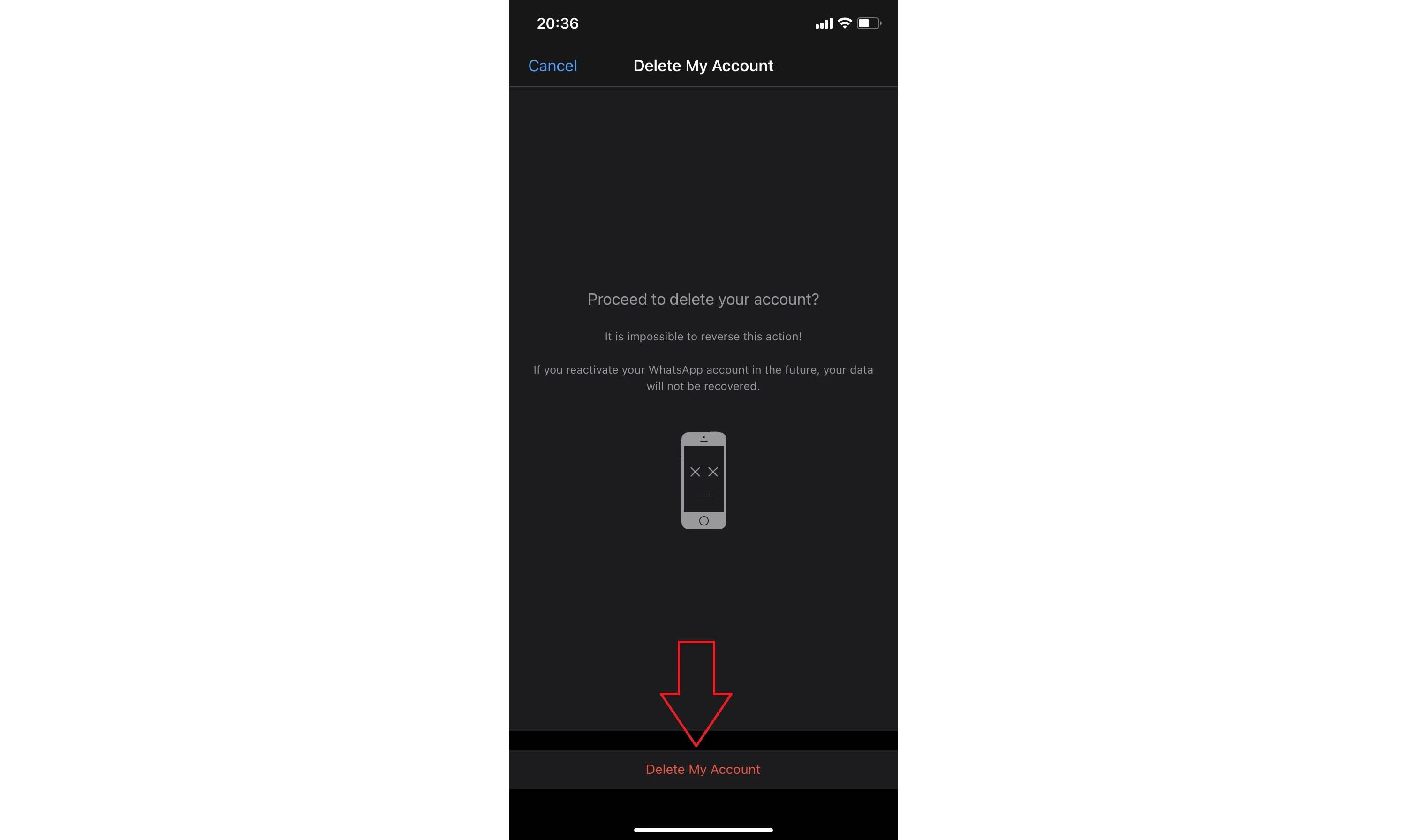 ۷. درنهایت، روی گزینهی قرمزرنگ Delete my account ضربه بزنید تا حساب کاربریتان در واتساپ برای همیشه حذف شود.
