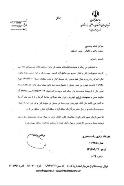 وی در این مکاتبه به بند (۳) بخشنامه معاون گمرک ایران یعنی بند مربوط به ممنوعیت ترانزیت خودروهای لوکس و آمریکایی اشاره داشته و گفته که " توجیه گمرک در ایجاد این محدودیت نامه آن معاونت (معاونت حقوقی رئیس جمهور) مبنی بر ممنوعیت واردات خودروهای برند آمریکایی، ساخت آمریکا یا با مبدا اولیه آمریکا به کشور است، در حالی که خودروهای مورد بحث در مناطق در سنوات قبل و در دوره قبل از اعمال ممنوعیت وارد شده و اکنون صرفا از یک منطقه به منطقه دیگر منتقل می شوند. "