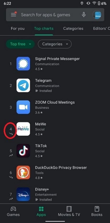 برای بررسی اینکه کدام برنامه ها روند صعودی یا رو به پایین دارند ، برنامه گوگل پلی را باز کنید. در ردیف بالای برگه ها ، بر روی نمودارهای برتر ضربه بزنید. از آنجا می توانید به نمودارهای مختلف بروید که بهترین برنامه ها را در دسته های خاص نشان می دهد. با نگاهی به نمودار رایگان برتر می توانید ببینید که سه برنامه برتر Signal Private Messenger ، Telegram و Zoom Cloud Meetings هستند. MeWe شماره چهار است و در زیر شماره چهار نمودار ، می توانید یک پیکان را ببینید که به سمت پایین است. این بدان معناست که روند رشد برنامه پایین است.