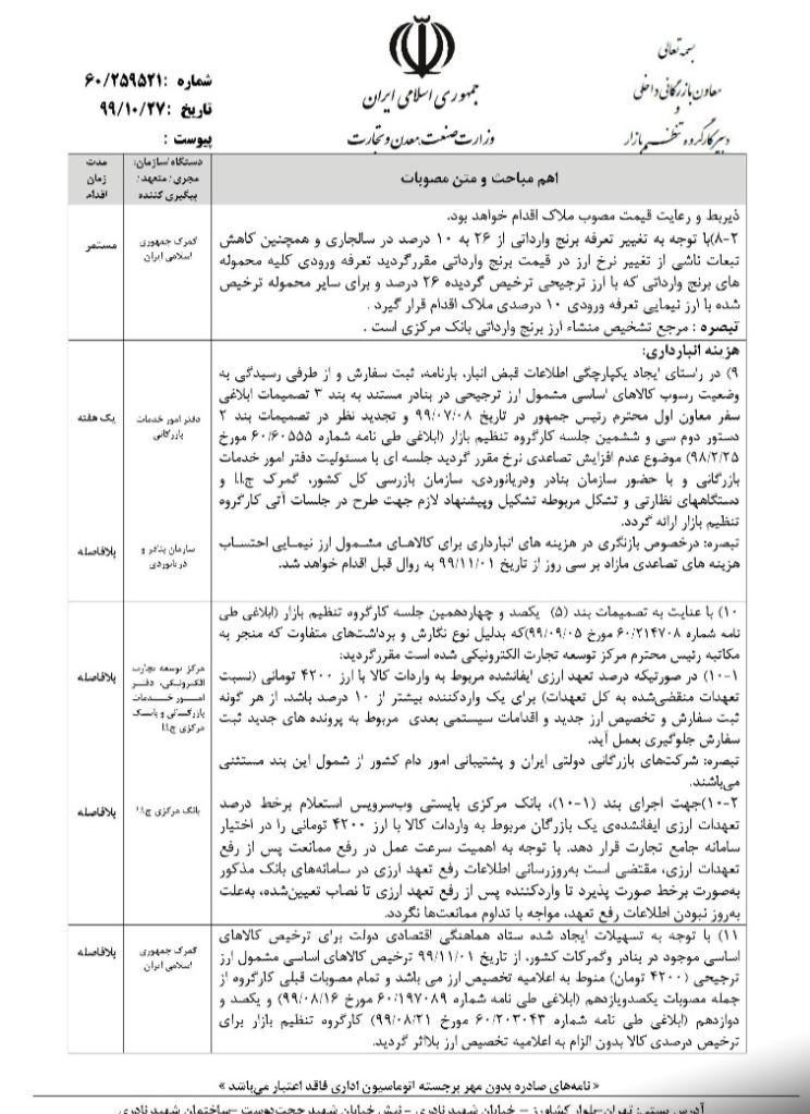 در متن مصوبه یکصد و بیست و یکیمن جلسه کارگروه تنظیم بازار آمده است: با توجه به تسهیلات ایجاد شده ستاد هماهنگی اقتصادی دولت برای ترخیص کالاهای اساسی موجود در بنادر و گمرکات کشور از تاریخ 1/11/1399 ترخیص کالاهای اساسی مشمول ارز ترجیحی (4200 تومان) منوط به اعلامیه تخصیص ارز می باشد و تمام مصوبات قبلی کارگروه از جمله مصوبات یکصد و یازدهم و یکصد و دوازدهم کارگروه تنظیم بازار برای ترخیص درصدی کالا بدون الزام اعلامیه تخصیص ارز بلااثر گردید.