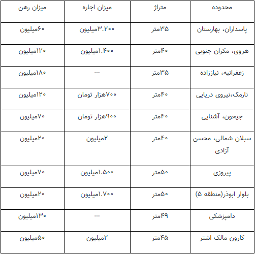 برای رهن و اجاره واحدهای کوچک متراژ ۳۰ تا ۵۰ متر در نقاط مختلف پایتخت باید بین ۲۰ تا ۱۸۰میلیون تومان رهن و همچنین ماهانه از ۷۰۰ هزار تومان تا ۳ میلیون و ۲۰۰ هزار تومان در نظر بگیرید.