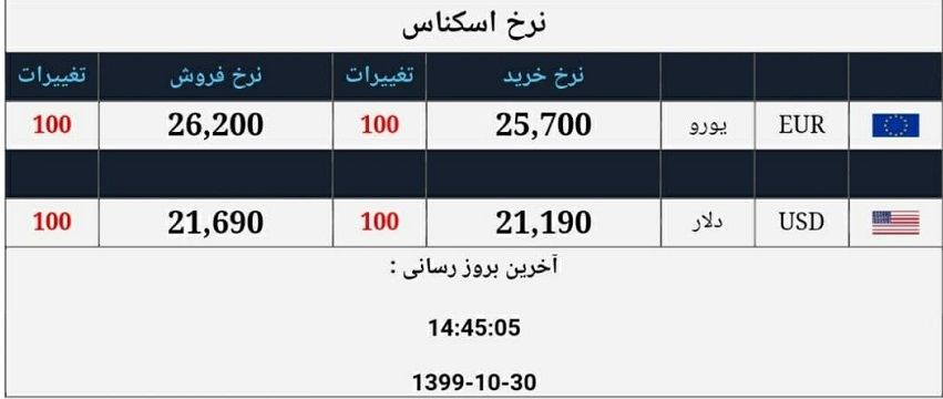 قیمت یورو نیز برای فروش در صرافی ملی 26200تومان اعلام شده؛ قیمت خرید یورو نیز در این صرافی 25700قیمت خورده است.