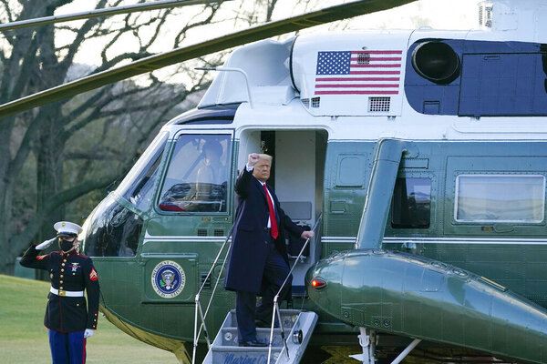 بالگرد رئیس‌جمهوری آمریکا دقایقی پیش در مقابل کاخ سفید فرود آمد. دونالد ترامپ، رئیس‌جمهوری ایالات متحده که دوره ریاست جمهوری اش چهار ساعت دیگر به پایان می رسد قرار است کاخ سفید را ترک کند.