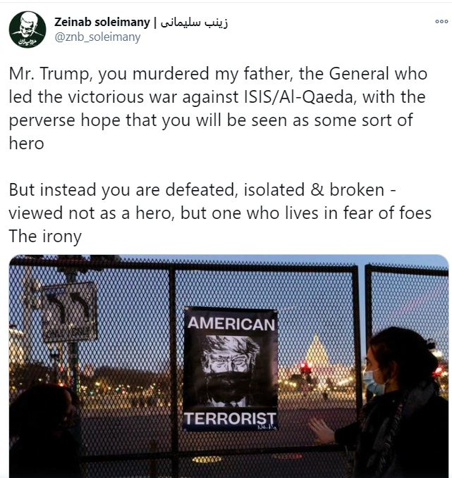 حساب توییتری منتسب به «زینب سلیمانی»، فرزند حاج «قاسم سلیمانی»، فرمانده شهید نیروی قدس سپاه پاسداران انقلاب اسلامی به پایان رژیم «دونالد ترامپ»، رئیسجمهور سابق آمریکا واکنش نشان داده است.