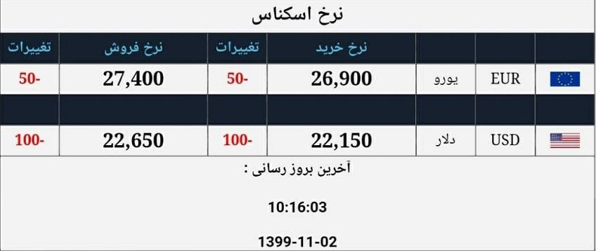نرخ ارز در صرافی ملی امروز پنج شنبه اعلام شد که بر این اساس قیمت دلار 100 تومان و یورو 50 تومان نسبت به روز گذشته کاهش یافت. بانک مرکزی امروز نیز نرخ ۴۷ ارز رسمی را اعلام کرد که بر اساس آن نرخ ۲۶ ارز از جمله پوند با افزایش و قیمت ۱۰ ارز با کاهش همراه شد، همچنین ارزش ۱۱ ارز نیز ثابت ماند.