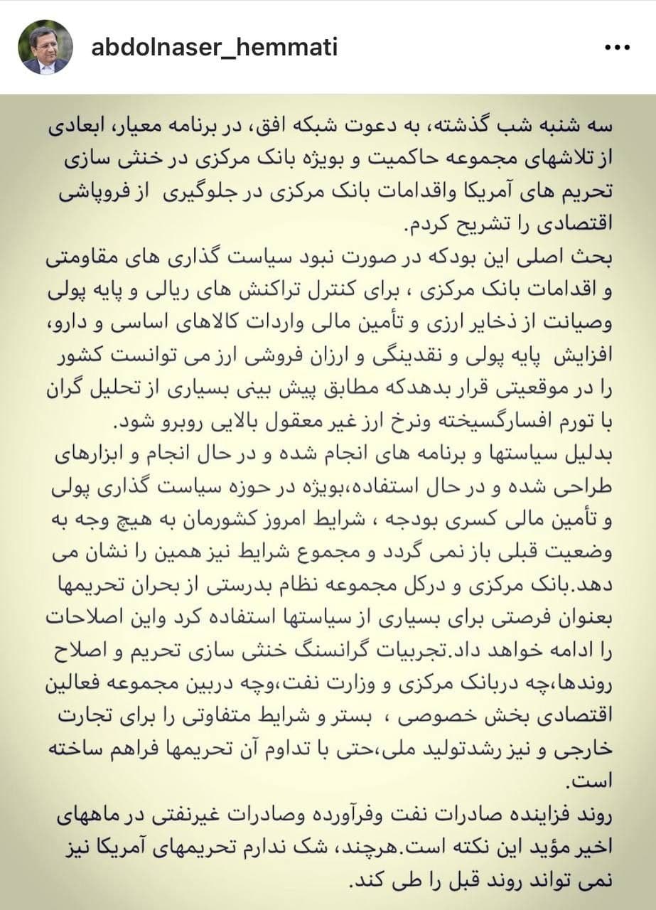 به گزارش سایت طلا،«عبدالناصر همتی» امروز (جمعه) در پست اینستاگرامی خود افزود: سهشنبه شب گذشته به دعوت شبکه افق در برنامه معیار ابعادی از تلاشهای مجموعه حاکمیت و به ویژه بانک مرکزی در خنثیسازی تحریمهای آمریکا و اقدامات بانک مرکزی در جلوگیری از فروپاشی اقتصادی را تشریح کردم.