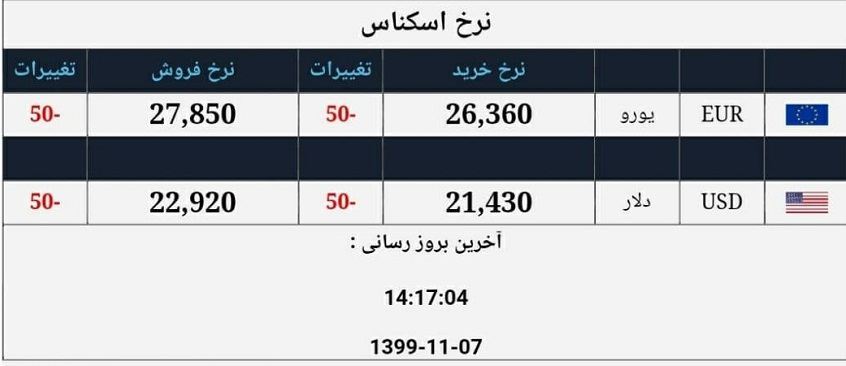 قیمت یورو نیز برای فروش در صرافی ملی27900 تومان اعلام شده؛ قیمت خرید یورو نیز در این صرافی 26410 قیمت خورده است.