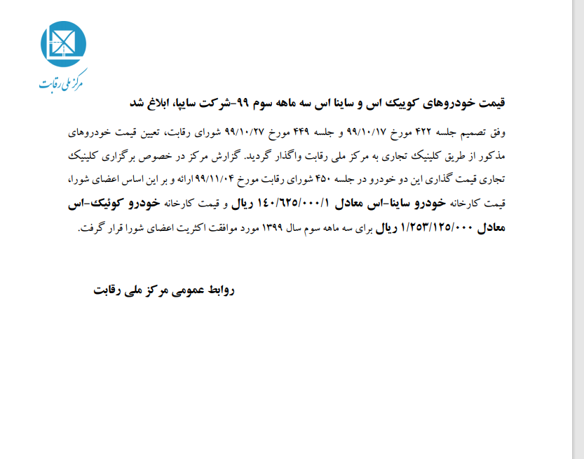 براین اساس قیمت کارخانه کوئیک اس ۱۲۵ میلیون و ۳۱۲ هزار و ۵۰۰ تومان و قیمت کارخانهای ساینا اس ۱۱۴ میلیون و ۶۲ هزار و ۵۰۰ تومان برای سه ماهه سوم سال تعیین شده است.