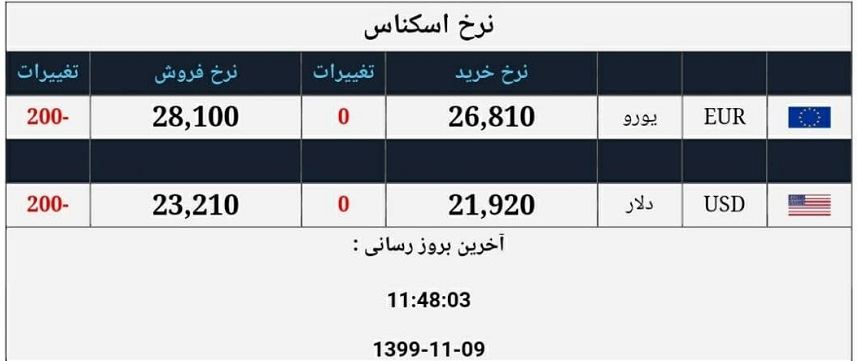 قیمت یورو نیز برای فروش در صرافی ملی28100 تومان اعلام شده؛ قیمت خرید یورو نیز در این صرافی26810قیمت خورده است.