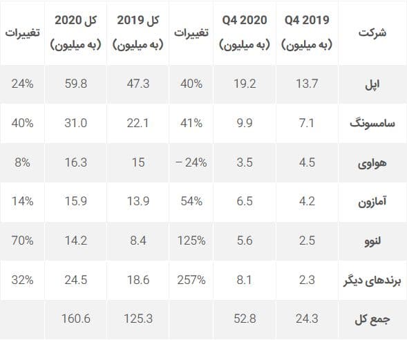 سه ماه پایانی 2020 برای شرکت لنوو هم بسیار فوقالعاده بود و فروش آنها 125 درصد بیشتر از دوره مشابه سال قبل ثبت شد. بدین ترتیب این شرکت چینی توانست خود را به جمع 5 تولیدکننده برتر تبلت در جهان برساند. هواوی تنها بازیگر بزرگی بود که نتوانست از این موقعیت استفاده کند، باوجود رشد کلی در مقایسه با سال گذشته، میزان فروش آنها در سه ماهه پایانی 24 درصد کمتر از دوره مشابه سال 2019 بود.