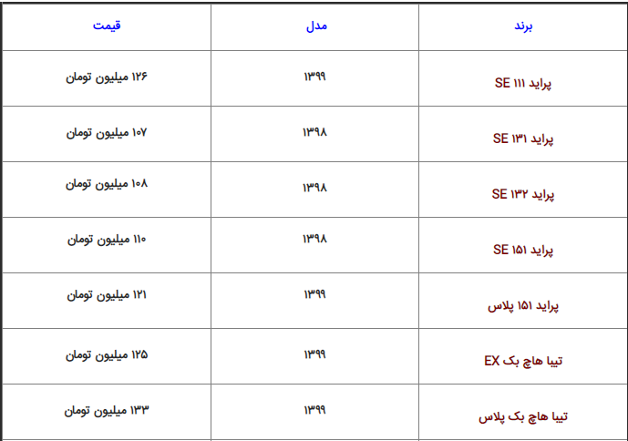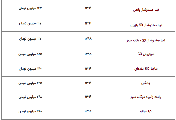 در بین خودروهای تیبا هم به جر تیبا صندوقدار SX دوگانه سوز مه مثل روز گذشته ۱۱۷ میلیون تومان قیمت دارد، تمامی مدلها هر کدام یک میلیون تومان گران شدند. اما قیمت وانت زامیاد دوگانه سوز با کاهش چهار میلیون تومانی، به ۲۴۸ میلیون تومان رسید.