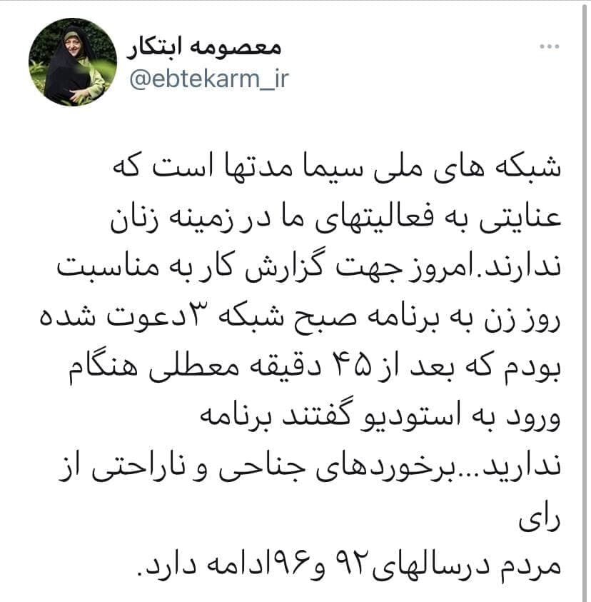 معصومه ابتکار، معاون زنان و خانواده ریاست جمهوری در صفحه توییترش از لغو ناگهانی برنامه تلویزیونی خود خبر داد و نوشت: «شبکههای ملی سیما مدتهاست عنایتی به فعالیتهای ما در زمینه زنان ندارند. امروز جهت گزارش کار به مناسبت روز زن به برنامه صبح شبکه ۳ دعوت شده بودم که بعد از ۴۵ دقیقه معطلی، هنگام ورود به استودیو گفتند برنامه ندارید. برخوردهای جناحی و ناراحتی از رای مردم در سالهای ۹۲ و ۹۶ ادامه دارد.»