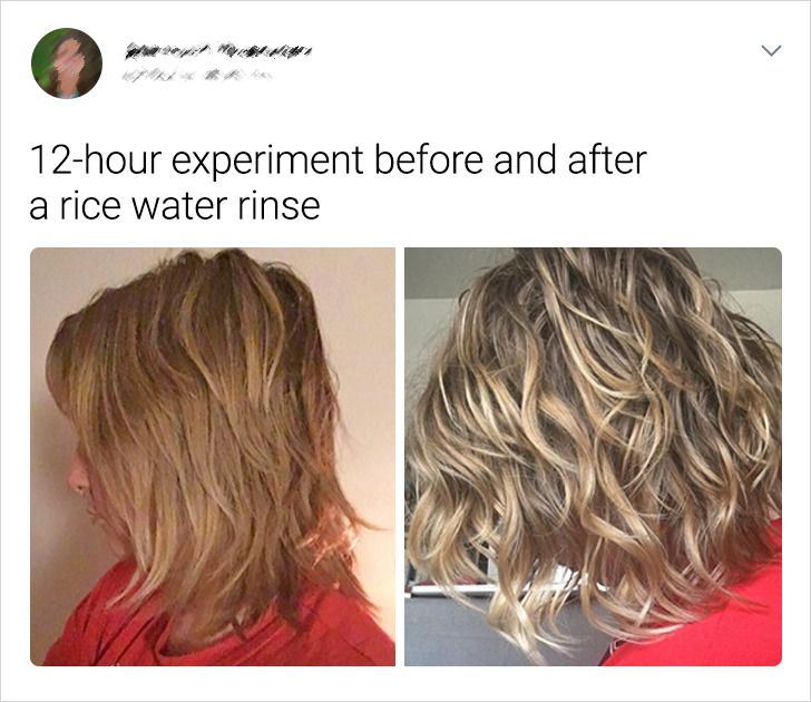 نصف پیمانه برنج را شسته و در 2 الی 3 پیمانه آب به مدت سی دقیقه خیس کنید. سپس آب برنج را صاف کنید. اکنون به حمام رفته و مانند معمول سرتان را با شامپو بشویید. سپس آب برنج را بر روی سر و موهای خود ریخته، ماساژ دهید و اجازه دهید که به مدت 20 دقیقه بر روی سر شما بماند.