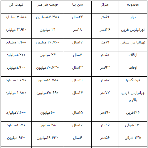 همچنین در محدوده بهار نیز یک واحد ۶۱متری، ۲۴ ساله به نرخ متری ۵۷.۳۸۰ میلیون تومان و قیمت نهایی ۳.۵ میلیارد تومان آگهی شده است.