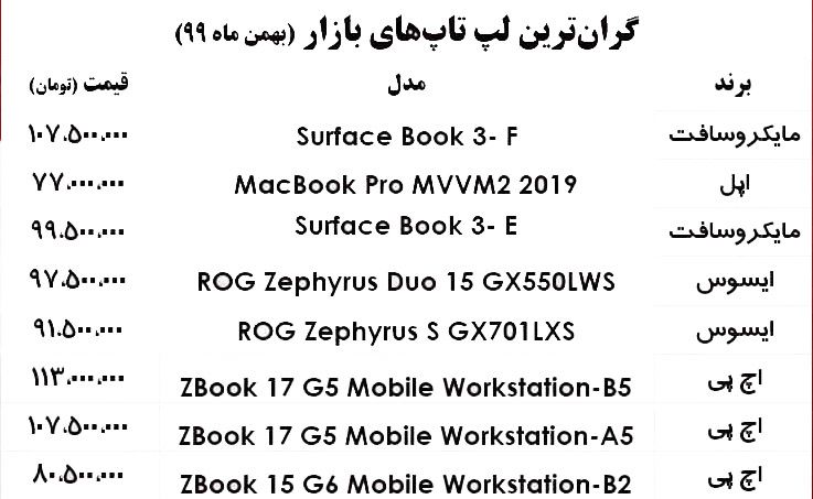 به گزارش موبوایران،در جدول زیر می توانید قیمت لوکسترین لپتاپهای بازار را مشاهده کنید.