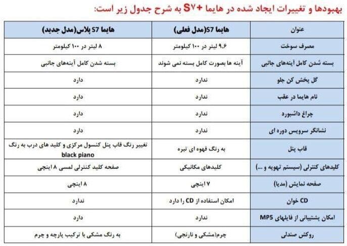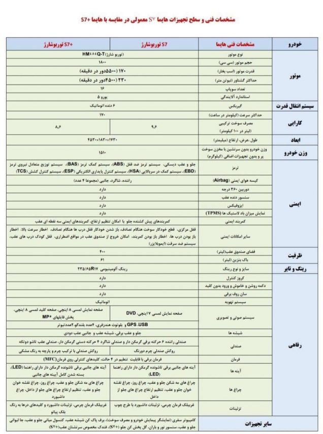در ادامه میتوانید جدول مقایسه هایما اس ۷ توربو پلاس با هایما اس ۷ توربو معمولی را مشاهده کنید