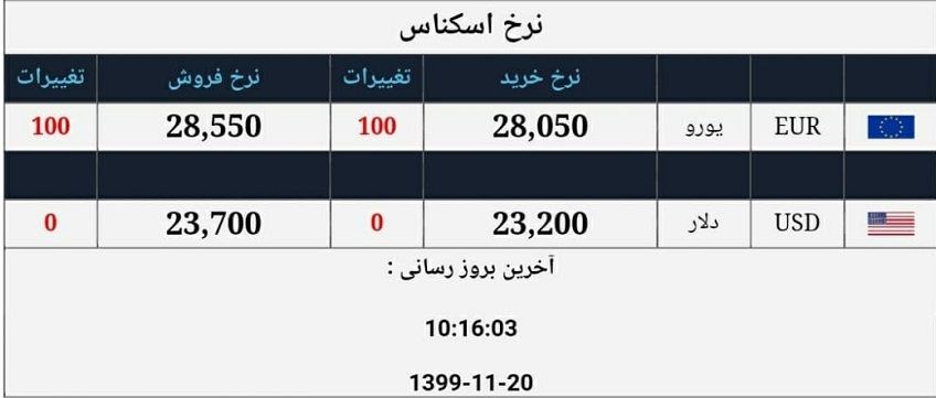 قیمت یورو نیز برای فروش در صرافی ملی 28550 تومان اعلام شده؛ قیمت خرید یورو نیز در این صرافی 28050قیمت خورده است.