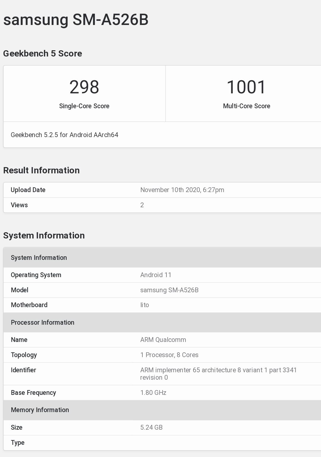 گلکسی A52 5G در بنچمارک گیکبنچ هم ظاهر شده که مشخصات آن را افشا میکند. این گوشی هوشمند از ۶ گیگابایت رم، چیپ اسنپدراگون 750G و سیستم عامل پیش فرض اندروید ۱۱ بهره میبرد.