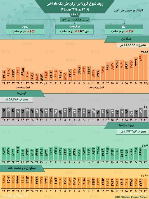 طبق اعلام وزارت بهداشت، ویروس کرونا تا ظهر چهارشنبه (۲۲ بهمن ۹۹) یک میلیون و ۴۸۱ هزار و ۹۸۱ نفر را در ایران به طور قطعی مبتلا کرده و در مجموع تا این روز ۵۸ هزار و ۶۸۶ نفر را به کام مرگ کشانده است. از سوی دیگر، یک میلیون ۲۷۲ هزار و ۲۸۷ نفر در ایران تاکنون بهبود یافته‌اند. بررسی آمارهای وزارت بهداشت نشان می‌دهد که طی ۱۰ روز اخیر (۱۳ تا ۲۲ بهمن) به طور متوسط در هر ساعت حدود ۲۹۶ نفر در ایران مبتلا و بین ۳ تا ۴ نفر قربانی این ویروس شده‌اند. البته در هر ساعت حدود ۲۵۹ نفر نیز بهبود یافته‌اند. در این اینفوگرافیک روند شیوع کرونا در ایران طی یک ماه اخیر (از ۲۲ دی تا ۲۲ بهمن) را مشاهده می‌کنید.