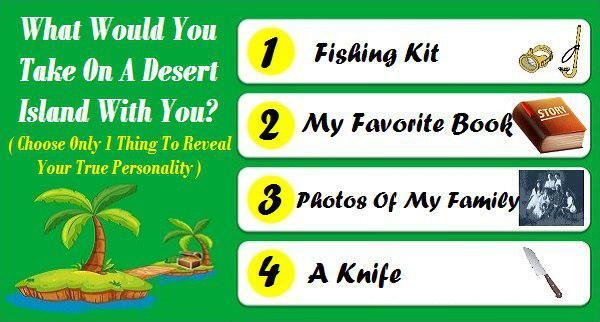تصور کنید که به یک جزیره بیابانی می روید و فقط می توانید یک چیز را با خود ببرید، آن وسیله چیست؟ برای آشکار کردن شخصیت واقعی خود، یکی از مواردی را که می خواهید در جزیره ای بیابانی با خود همراه کنید را انتخاب کنید.