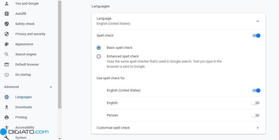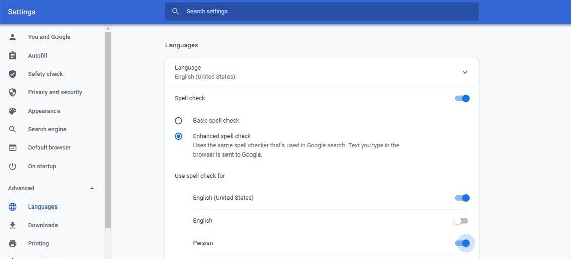 در صفحه تنظیمات در نوار سمت چپ، روی گزینه Advanced کلیک کنید. در منویی که باز میشود، گزینه Language را انتخاب کنید. در این بخش باید گزینه Spell Check را فعال کنید. بد نیست بدانید با جستجوی کلمه Spell هم میتوانید در تنظیمات به چنین بخشی دسترسی پیدا کنید. در بالای این بخش، گزینه زبان به چشم میخورد که در کنار زبان انگلیسی، باید فارسی را هم به آن اضافه کنید.