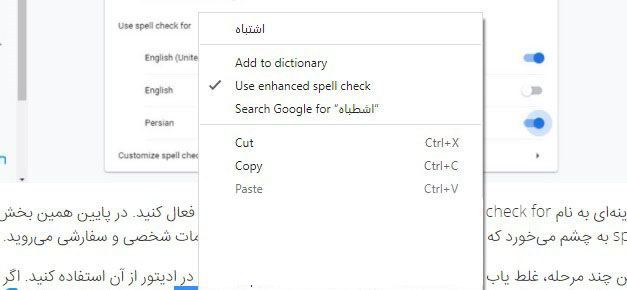 تنها با همین چند مرحله، غلط یاب املایی فارسی در کروم فعال میشود و میتوانید در ادیتور از آن استفاده کنید. اگر یک کلمه را اشتباه تایپ کنید، زیر آن یک خط قرمز رنگ قرار میگیرد. با کلیک راست روی این کلمه اشتباه، یک منو باز میشود که در بالای آن املای صحیح کلمه به چشم میخورد که با کلیک روی آن، جایگزین کلمه اشتباه میشود.