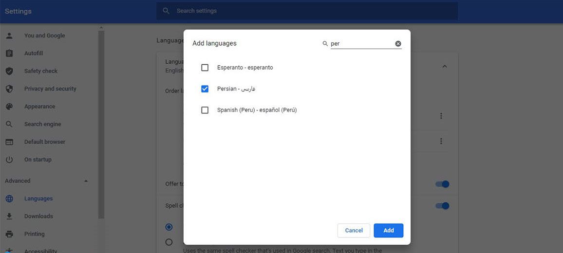 روی منوی کشویی Language کلیک کرده و گزینه Add languages را انتخاب کنید. در پنجرهای که باز میشود، با تایپ کلمه Persian یا فارسی، زبان فارسی را پیدا کرده، آن را انتخاب و در پایان روی گزینه Add کلیک کنید.