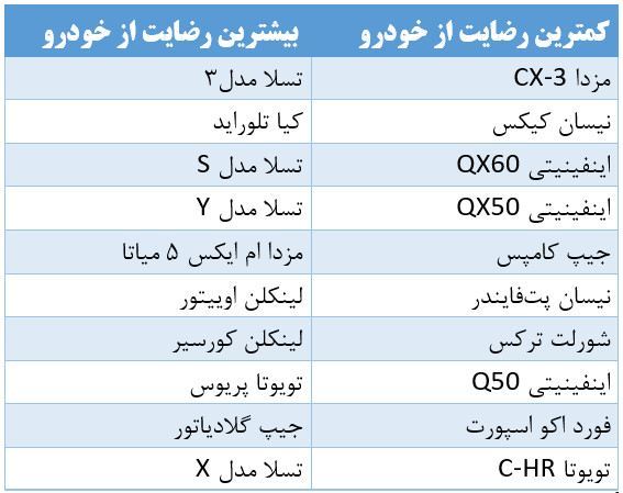 در جدول زیر به ترتیب خودروهایی که بیشترین و کمترین رتبه را در بین رضایت مشتریان دارند لیست شده اند.