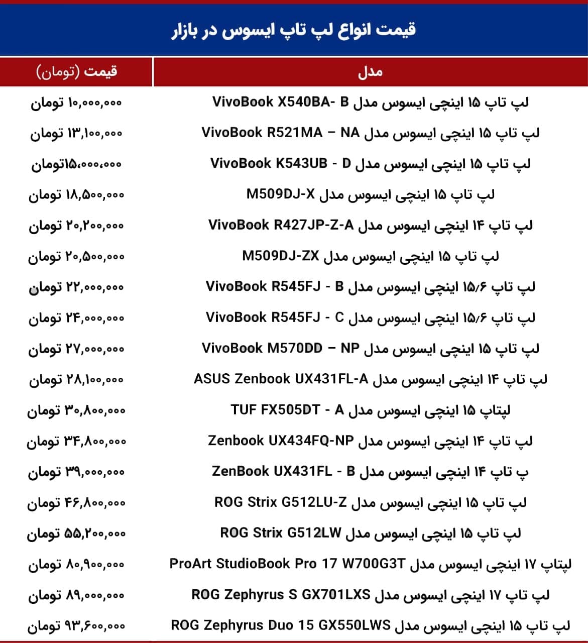 لیست قیمت انواع لپ تاپ ایسوس در بازار 25 بهمن 99