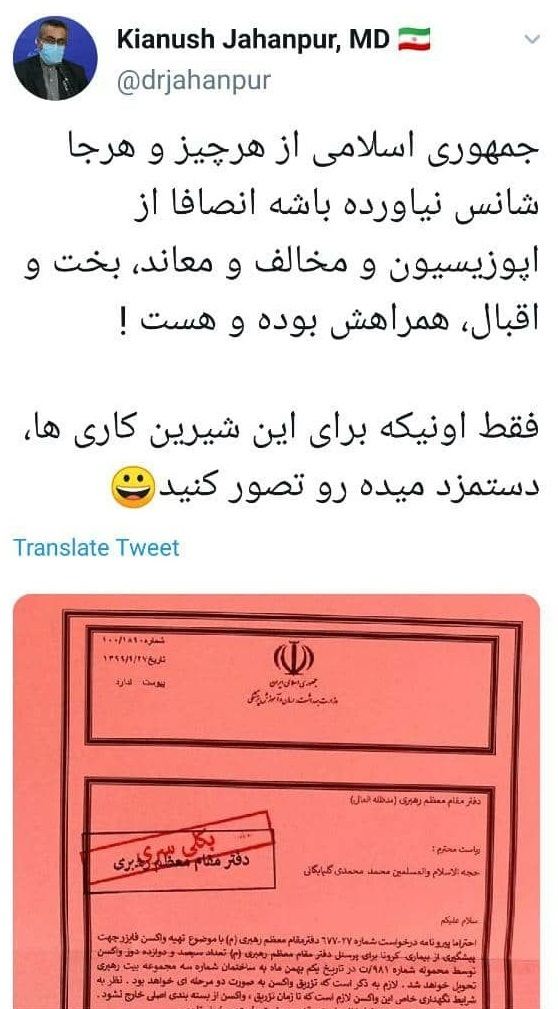 کیانوش جهانپور رئیس مرکز روابط عمومی و اطلاعرسانی وزارت بهداشت، درمان و آموزش پزشکی با انتشار پستی در صفحه توییتر خود، به شایعه تزریق واکسن فایزر کرونا به برخی از مقامات کشور واکنش نشان داد.
