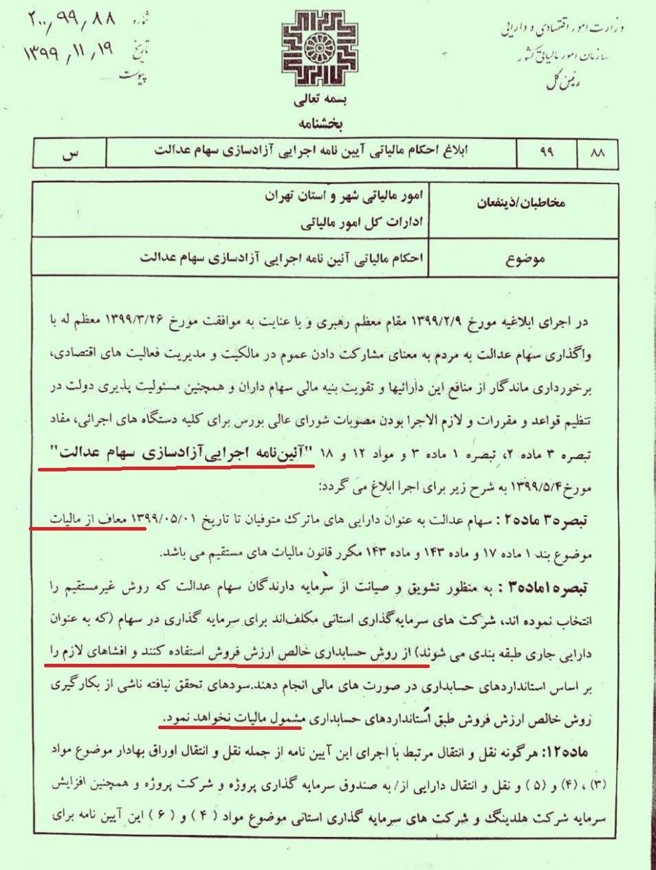 بر اساس تبصره 3 ماده 2 این ابلاغیه، سهام عدالت به عنوان دارایی های ماترک متوفیان تا تاریخ 1/ 5/ 1399 ، معاف از مالیات موضوع بند 1 ماده 17 و ماده 143 و ماده 143 مکرر قانون مالیات های مستقیم می باشد.