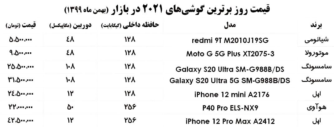 به گزارش موبوایران ،قیمت برترین گوشی های 2021 در بازار به شرح زیر است