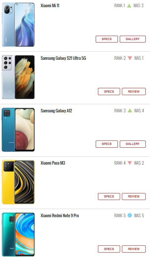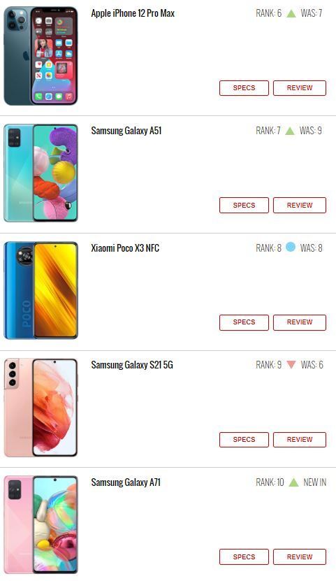 ردمی نوت 9 پرو شرکت شیائومی، برای دومین هفته متوالی در جدول پنجم است، در حالی که گوشی iPhone 12 Pro Max کمپانی اپل، که هفته قبل در رده هفتم قرار داشت، خود را یک پله بالا کشیده تا رتبه ششم را تصاحب کند.