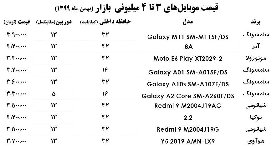 با هزینه بین 3 تا 4 میلیون تومان میتوانید گوشی های زیر را تهیه کنید