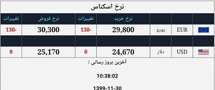 قیمت یورو نیز برای فروش در صرافی ملی 30300 تومان اعلام شده؛ قیمت خرید یورو نیز در این صرافی 29800 تومان قیمت خورده است.