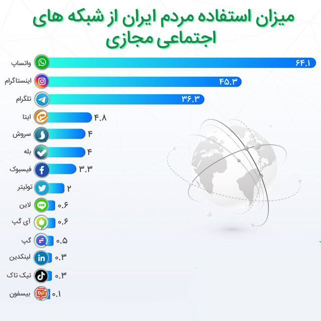 پس از تلگرام، ۴.۸ درصد از ایتا، ۴ درصد از سروش، ۴ درصد از بله، ۳.۳ درصد از فیسبوک و ۲ درصد افراد بالای ۱۸ سال کشور از توییتر استفاده میکنند.