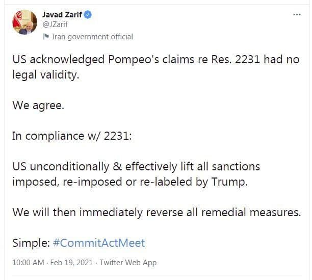 وزیر خارجه ایران با بیان اینکه دولت جدید آمریکا متوجه شد که ادعاها درباره قطعنامه ۲۲۳۱ هیچ اعتبار قانونی ندارد، تاکید کرد واشنگتن باید تمام تحریمها را بی قید و شرط و بهصورت مؤثر بردارد.