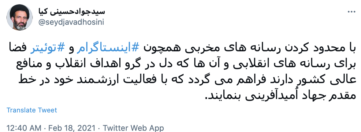 سیدجواد حسینی کیا در صفحه توئیتر خود نوشت: "با محدود کردن رسانههای مخربی همچون اینستاگرام و توئیتر فضا برای رسانههای انقلابی و آنها که دل در گرو اهداف انقلاب و منافع عالی کشور دارند فراهم میگردد که با فعالیت ارزشمند خود در خط مقدم جهاد اُمیدآفرینی بنمایند."