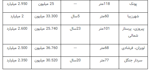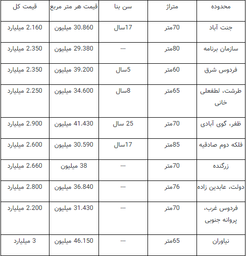 حداکثر قیمت هم مربوط به یک آپارتمان 65 متری در نیاوران است که با نرخ متری 46 میلیون و 150 هزار تومان و قیمت کل 32 میلیارد تومان به فروش می رسد.
