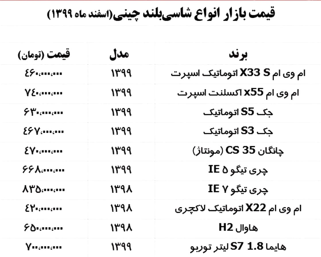 جدیدترین قیمت خودروهای شاسی بلند چینی