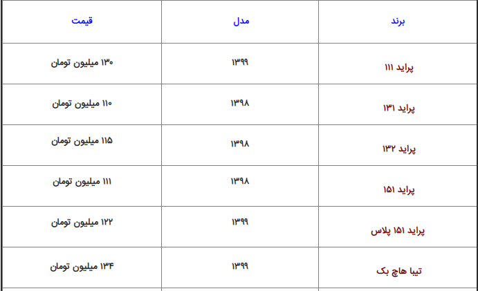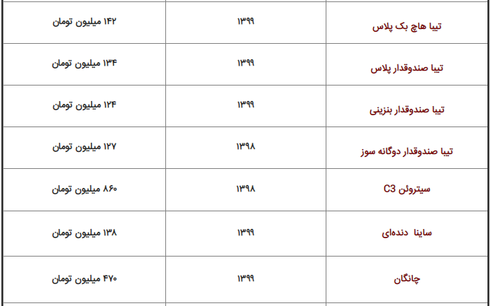 تیبا هاچ بک ۱۳۴ میلیون تومان، تیبا صندوقدار بنزینی ۱۲۴ میلیون تومان و ساینا دندهای هم ۱۳۸ میلیون تومان قیمتگذاری شدهاند.